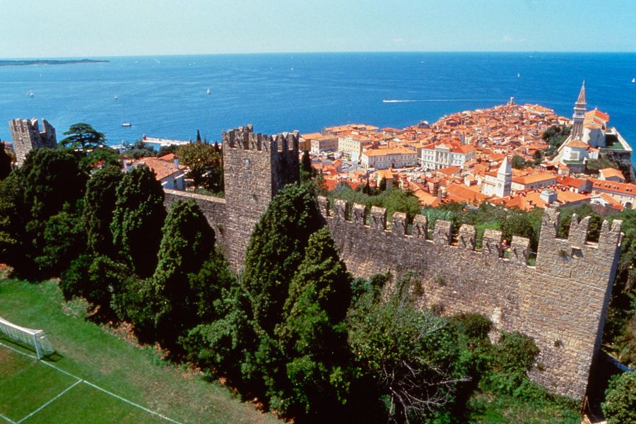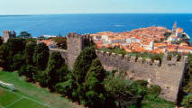 Piransko mestno obzidje Piran ima visoko mestno obzidje, s katerega je čudovit pogled na mesto, morje ter Italijo v daljavi. Namenjeno je bilo obrambi. Ima rahlo poševen nagib. Je lahko dostopno iz mestnega jedra in vredno ogleda. Piransko obzidje je mestno obzidje, ki je obdajalo Piran. Deli obzidja so ohranjeni še danes. Samo obzidje je sestavljeno iz treh različnih obzidij, ki so nastala zaradi širjenja mesta in so tako morali dvakrat zgraditi novo obzidje. Najstarejše mestno jedro je bilo v 7. stoletju razdeljeno na četrti, ki so se imenovale po mestnih vratih: Miljska, Stolna, Osrednja in Poljska. Takrat zgrajeno obzidje danes oklepa mestno jedro. Z razvojem mesta se je se je obzidje premikalo proti jugovzhodu in sproti vključevalo posamezne nove četrti, ki so nastale zunaj njega. Del obzidja, ki ga je obdajal najstarejši del mesta na področju rta, se v svojem poteku ni spreminjalo, potrebno pa ga je bilo večkrat obnoviti. Drugo obzidje je vključilo četrt Marčano. Njegov ostanek so ohranjena prva Rašporska vrata. V začetku 16. stoletja je tretje obzidje zaobjelo celoten polotok. Dokončno je bilo zgrajeno v letih od 1470 do 1534 in je imelo osem obrambnih stolpov. Po svojih oblikah se je prilagajalo srednjeveškemu načinu vojskovanja. Ohranilo se je sedem mestnih vrat, ki so nekdanji vhodi skozi obzidje v mesto. V končni fazi širitve, ki se je vršila med letoma 1470 in 1533, je tretje obzidje zaobjelo celoten polotok. V tem vmesnem času je nastalo tudi drugo obzidje, ki je vključevalo četrt Marčano. Največji del ohranjenega obzidja sodi v čas od začetka 15. do sredine 16. stoletja in je postalo sestavni del srednjeveške mestne strukture. Izjemno zgodovinsko vrednost ima njegov najobsežnejši ohranjeni ostanek tretjega obzidja na področju Mogorone, s katerim se zgodovinsko mestno jedro zaključuje. Obzidje je nastajalo postopno, večji del pa prav takrat, ko se je zaradi uporabe smodnika spremenil način bojevanja, kar je zahtevalo nov način mestne obrambe. Po oblikah se je mestno obzidje prilagajalo srednjeveškemu načinu vojskovanja. Do danes se je ohranilo sedem mestnih vrat, nekdanjih vhodov skozi obzidje v mesto. Prva Rašporska vrata v gotskem slogu so bila zgrajena v sklopu mestnega obzidja. Do njih lahko pridemo po Rozmanovi ulici. Druga Rašporska vrata (tudi v Rozmanovi ulici) so bila zgrajena leta 1470. Z njimi se zaključuje strnjen del tretjega obzidja s sedmimi stolpi, ki imajo značilno zašiljen lok in še vidne kamnite tečaje vrat. Mestna vrata Marčana so bila zgrajena leta 1534. Vodijo v današnjo Ulico svobode. Grajena so v renesančnem slogu in tvorijo del tretjega obzidja. Miljska vrata iz 13. stoletja so med najstarejšimi ohranjenimi vrati v mestu. Ime so dobila po stari Miljski ulici v mestni četrti Punta, ki je vodila proti morju. Dolfinova vrata (Savudrijska ulica) so najlepša ohranjena gotska vrata v mestu. Zgrajena so bila leta 1483, postaviti pa jih je dal takratni župan Dolfin. Spoznamo jih po značilnem grbu s tremi delfini. So tudi edina vrata v mestu, ki so obdržala izvirno obliko – preprosto formo šilastega gotskega loka. Poljska vrata so verjetno iz 15. stoletja. Ob njih je nekoč stala cerkvica ali kapela sv. Jakoba, ki je bila povezana z Ložo in z nekdanjo Mestno hišo. Baročna vrata sv. Jurija so zlita s Sodno palačo, zato jih marsikateri popotnik ne dojema kot samostojen objekt, pač pa kot del palače. Obnovljena so bila leta 1660. Pomorski muzej Sergej Merše Piran Pomorski muzej »Sergej Mašera« Piran je muzej za zgodovino pomorstva na Slovenskem. Muzej je bil ustanovljen leta 1954 kot Mestni muzej Piran, v prostorih klasicistične palače Gabrielli-De Castro na Cankarjevem nabrežju. Muzej je sprva vključeval tudi piransko mestno knjižnico in mestni arhiv. Sedanji naziv po narodnem heroju Sergeju Mašera je dobil leta 1967.Muzej zbira in preučuje slovensko pomorsko preteklost in na pomorstvo vezane gospodarske panoge. Ima arheološko zbirko o pomorskih poteh in trgovini od prazgodovine do srednjega veka in zbirko naselbinskih ostankov s kopnega in iz morja. Etnološka solinarska zbirka prikazuje postopek pridobivanja solii s pomočjo starih fotografij, maket, orodja in predmetov iz vsakdanjega življenja solinarjev. Etnološko ribiško zbirko bogatijo številni ladijski modeli, orodja in pripomočki za zasebni in industrijski ribolov ter prikazi različnih načinov predelave rib. V osrednji zgodovinski, etnološki in umetnostnozgodovinski zbirki pomorstva od srednjga veka do konca druge svetovne vojne so razstavljeni Gruberjevi ladijski modeli, ladijski modeli različnih tipov ladij od galej do velikih jadrnic, instrumenti z ladij, uniforme, likovna dela slikarjev marinistov, različna ladijska oprema, fotografije z ladij in drugo. Poleg trgovske mornarice se zbirke deloma nanašajo tudi na vojne mornarice tistih držav, katerih del je bilo slovensko etnično ozemlje. Piranski svetilnik Svetilnik se nahaja na sami konici Piranskega polotoka, na rtu Madona. Piranski svetilnik sestavljajo povezani objekti, ki jih poleg ostanka svetilnika in utrdbe s svetilničarjevim stanovanjem sestavljata še cerkev Marije Zdravja in stolp. Znamenita kamnita utrdba je bila sezidana leta 1617 in je bila del nekdanjega mestnega obzidja. Trdnjava je postala svetilnik v času med 1871 in 1872, ko so nanjo postavili rdečo luč in zraven nje manjši kamniti objekt za potrebe strojnice. O postavitvi svetilnika se je ohranila kamnita plošča, ki ima letnico 1872. Stanovanje za svetilničarja je bilo na utrdbi narejeno leta 1874. Sezidano je iz belih, precej grobo obdelanih kvadrov slikovitega istrskega kamna.